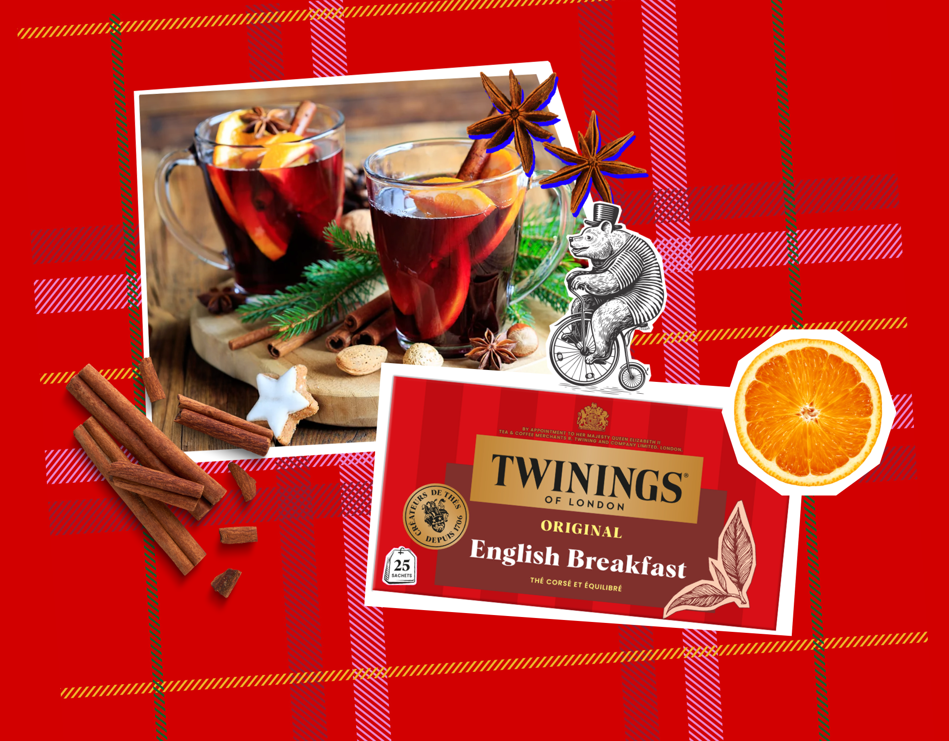 Dans une grande casserole, faites chauffer doucement le vin rouge sans le faire bouillir (on garde les bonnes vibes !). Ajoutez les sachets de Thé Noir Twinings, la cannelle, les clous de girofle, la badiane, et les zestes d’orange et de citron.