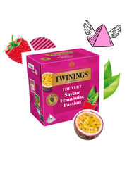 Le Créateur de Thés révèle la douceur du thé vert d'Inde, la saveur sucrée de la framboise et la saveur exotique du fruit de la passion.